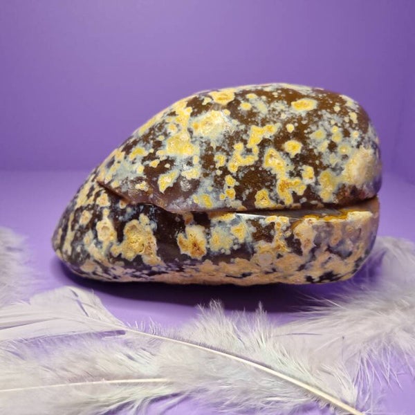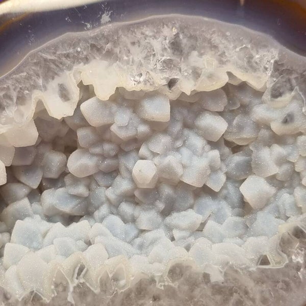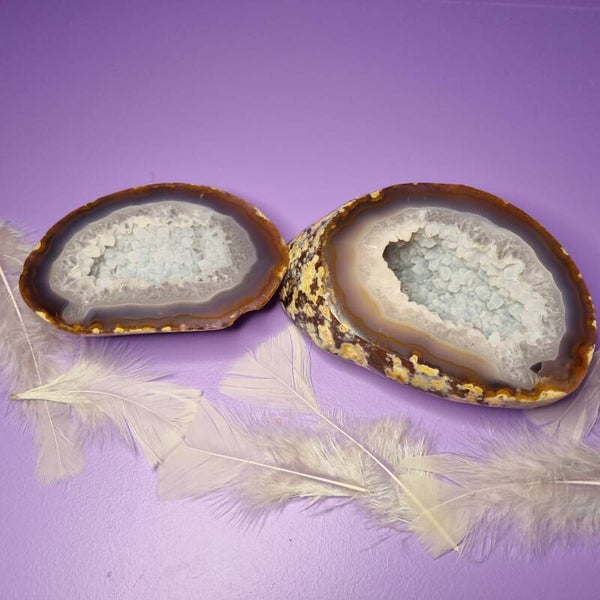 Aan de buitenzijde omhult de warme, aardse agaatkleur het stuk met rust en stabiliteit. Binnenin opent zich een kristallen wereld vol glans en diepte, gevormd door moeder natuur over miljoenen jaren.