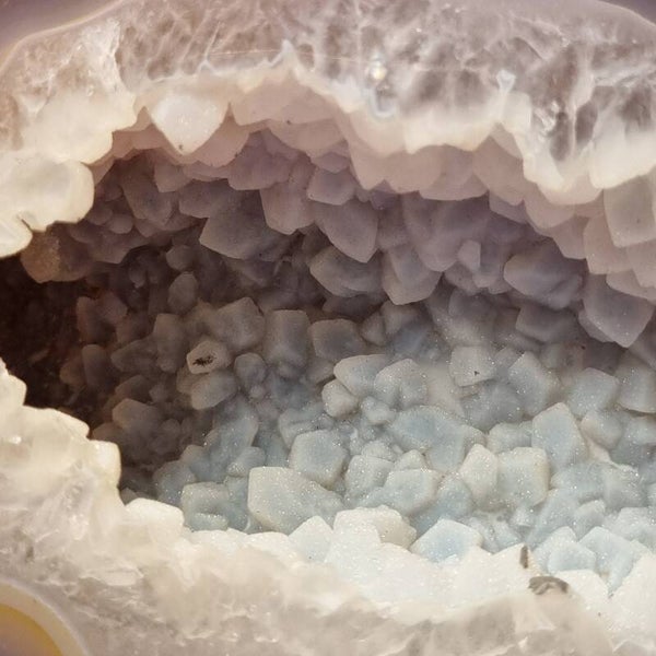 De zachte tinten grijs, wit en lichtblauw creëren een harmonieuze uitstraling, terwijl de glinsterende kwartspunten het licht op magische wijze vangen. Deze geode is niet alleen een schitterend decorstuk, maar wordt ook gezien als een bron van balans, helderheid en positieve energie.