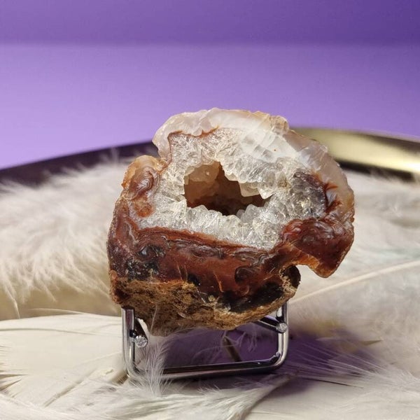 Van buiten oogt ze ruw en bescheiden, maar wie haar opent, ontdekt een wereld vol glans π. De agaat geode is ontstaan in vulkanisch gesteente, waar mineralen zich miljoenen jaren lang in lagen hebben gevormd, met een hart van fonkelende kwartskristallen. Elke laag vertelt een verhaal over tijd, vuur en stilte.