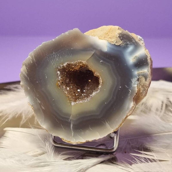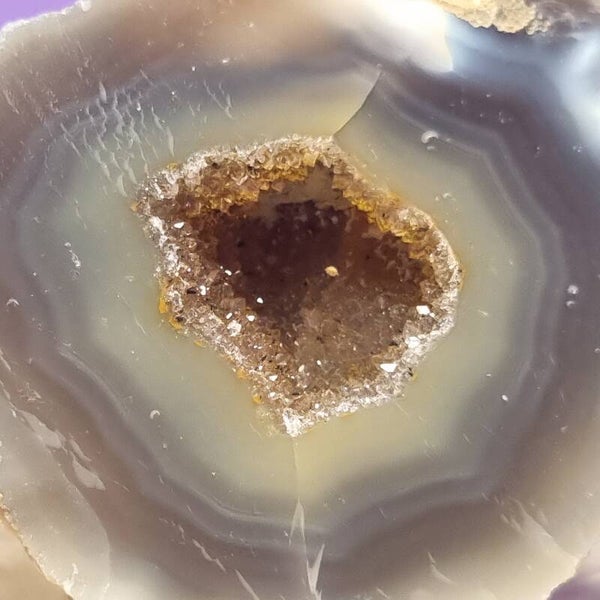 Van buiten oogt ze ruw en bescheiden, maar wie haar opent, ontdekt een wereld vol glans π. De agaat geode is ontstaan in vulkanisch gesteente, waar mineralen zich miljoenen jaren lang in lagen hebben gevormd, met een hart van fonkelende kwartskristallen. Elke laag vertelt een verhaal over tijd, vuur en stilte.