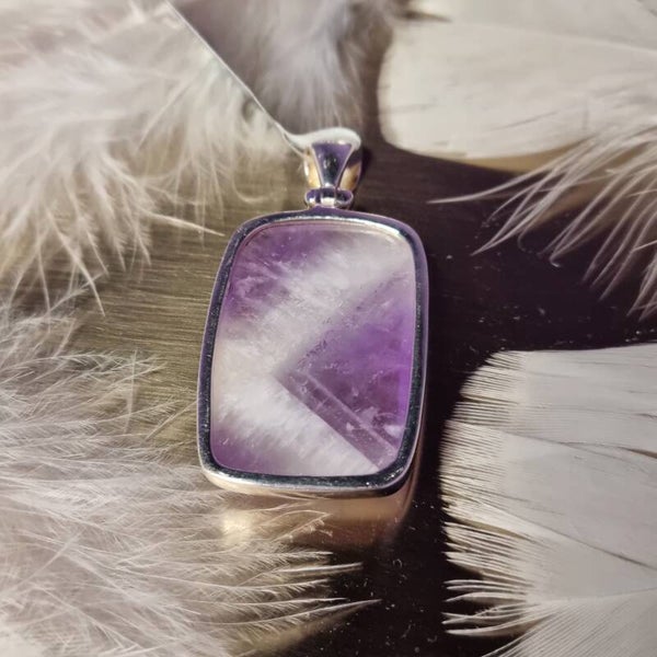 Deze hanger draagt een bijzondere chevron amethist, ook wel “dogtooth amethist” genoemd. Het kenmerkende patroon van diepe paarse tinten met zachte witte lijnen maakt elke steen uniek ✨.