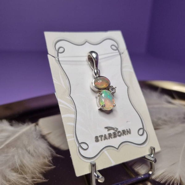 Deze Hanger draagt twee betoverende edelstenen: Ethiopische Opaal en Witte Topaas. De Opaal straalt met haar speelse kleuren van vuur, geel en oranje, terwijl de Topaas schittert in helder, sprankelend wit licht ✨. Samen vormen ze een harmonie van kleur, licht en energie, waardoor elke steen uniek is.