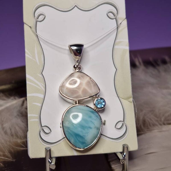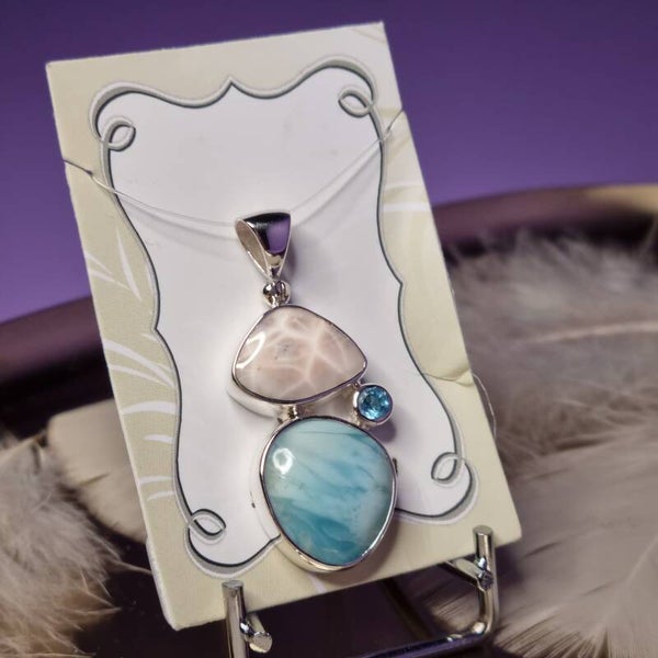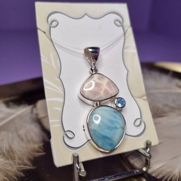 💎 Larimar, Blauwe Topaas & Roze Natroliet Hanger – 925 Sterling Zilver