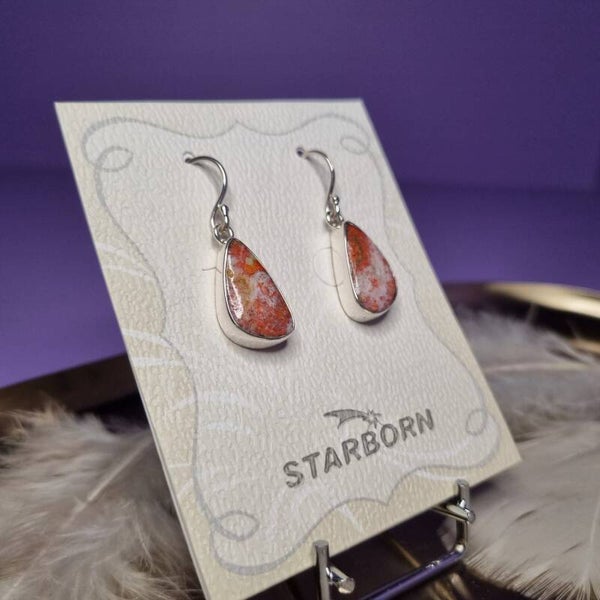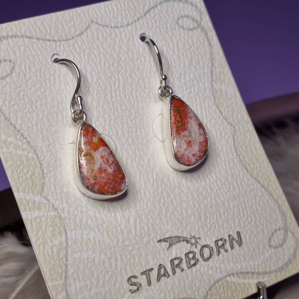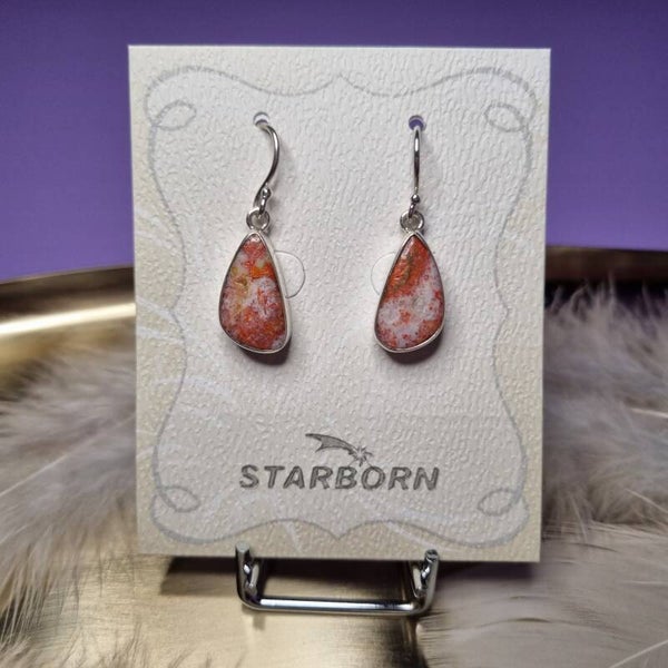 Deze elegante oorhangers dragen de kracht van Magma Chalcedoon, een prachtige steen die bekendstaat om haar warme kleuren en harmoniserende energie. Het natuurlijke spel van rood, oranje en geel maakt elke steen uniek en betoverend ✨.