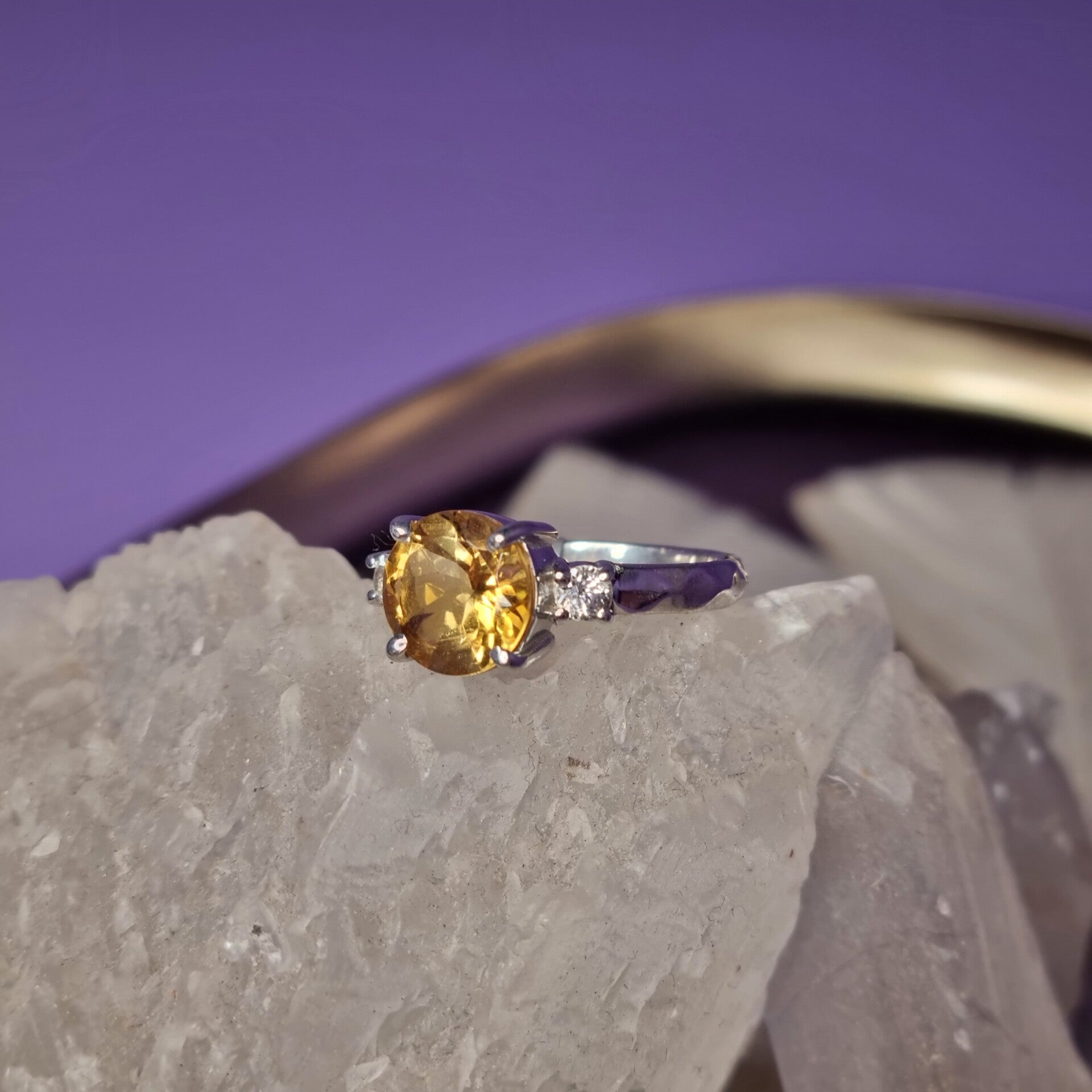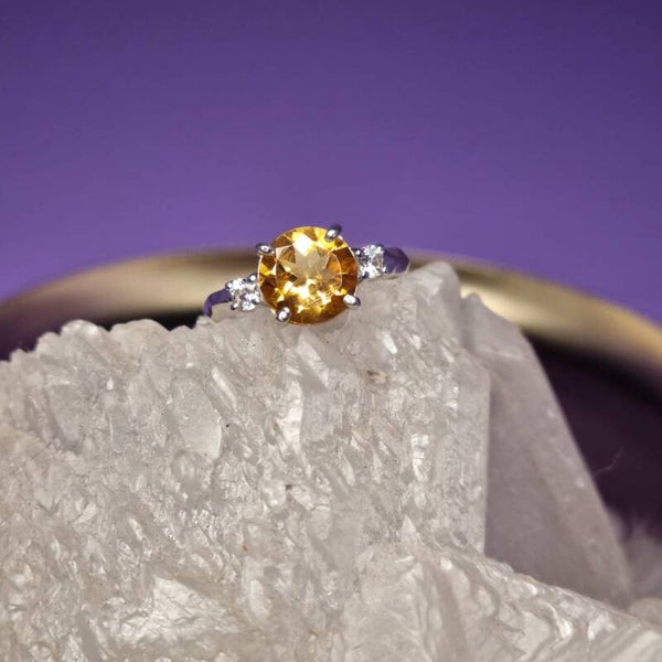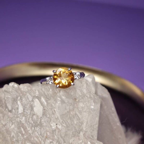 Deze ring is gezet met een stralende citrien en fonkelende witte topaas, een combinatie van warme zongele tinten en heldere sprankeling ✨. Elke steen is uniek, waardoor jouw ring een bijzonder en persoonlijk sieraad is.