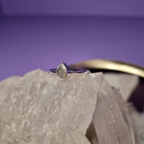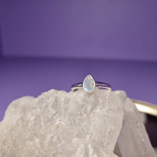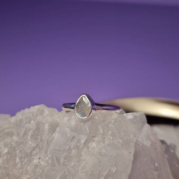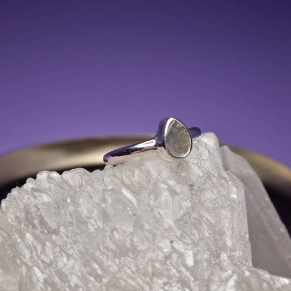 Deze ring draagt een prachtige Labradoriet, een mystieke kristalsteen die bekendstaat om haar beschermende energie en betoverende kleurenschijn. Elke steen is uniek, met een spel van blauw, groen en zilveren glans dat bij iedere beweging lijkt te dansen ✨.