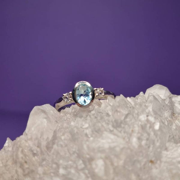 Deze ring verenigt de kracht van Blauwe Topaas en Witte Topaas. De blauwe steen schittert in zacht, helderblauw dat symbool staat voor rust en communicatie, terwijl de witte steen straalt met een sprankelend, zuiver licht dat zuiverheid en helderheid uitdrukt ✨. Samen vormen ze een harmonieuze combinatie van kalmte en kracht.