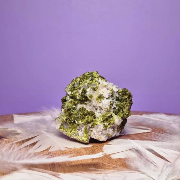 Laat je meevoeren door de levendige, mosgroene energie van Epidoot met Kwarts — een bijzondere combinatie die kracht, helderheid en vernieuwing samenbrengt. Deze prachtige steen staat symbool voor persoonlijke groei, emotionele balans en het vrijmaken van nieuwe mogelijkheden.