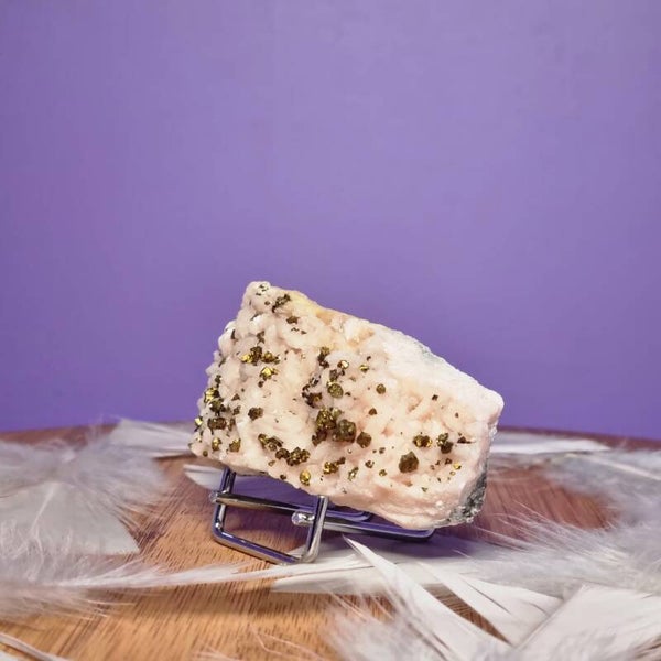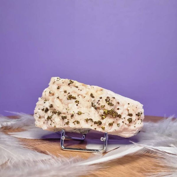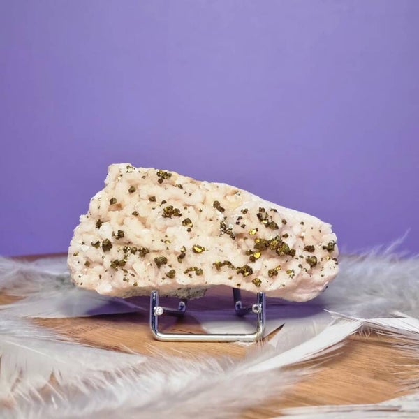 Deze bijzondere combinatie uit Bou Bekker valt op door zijn zachte roze dolomietbasis met daarop kleine, helder goudkleurige chalcopyrietkristallen. Het contrast tussen de pastelroze ondergrond en de metaalglans van het chalcopyriet maakt dit stuk zowel elegant als opvallend.