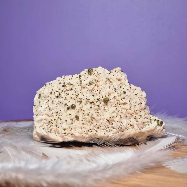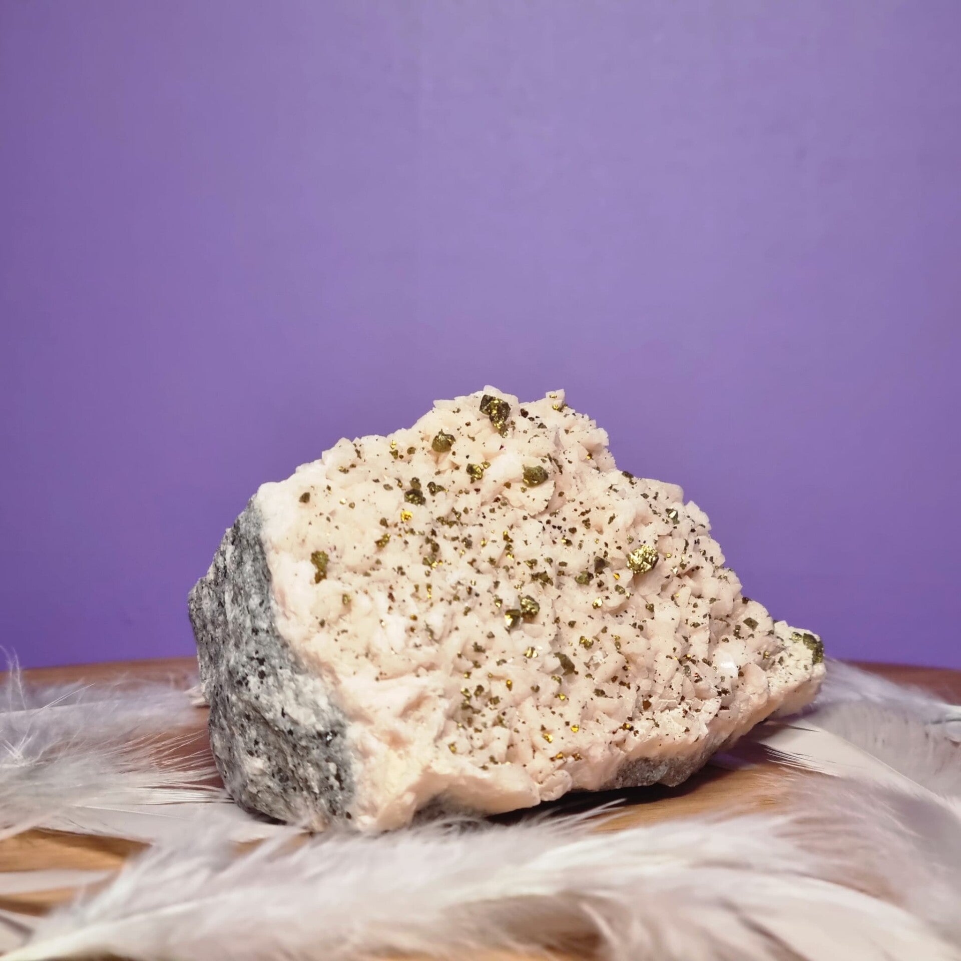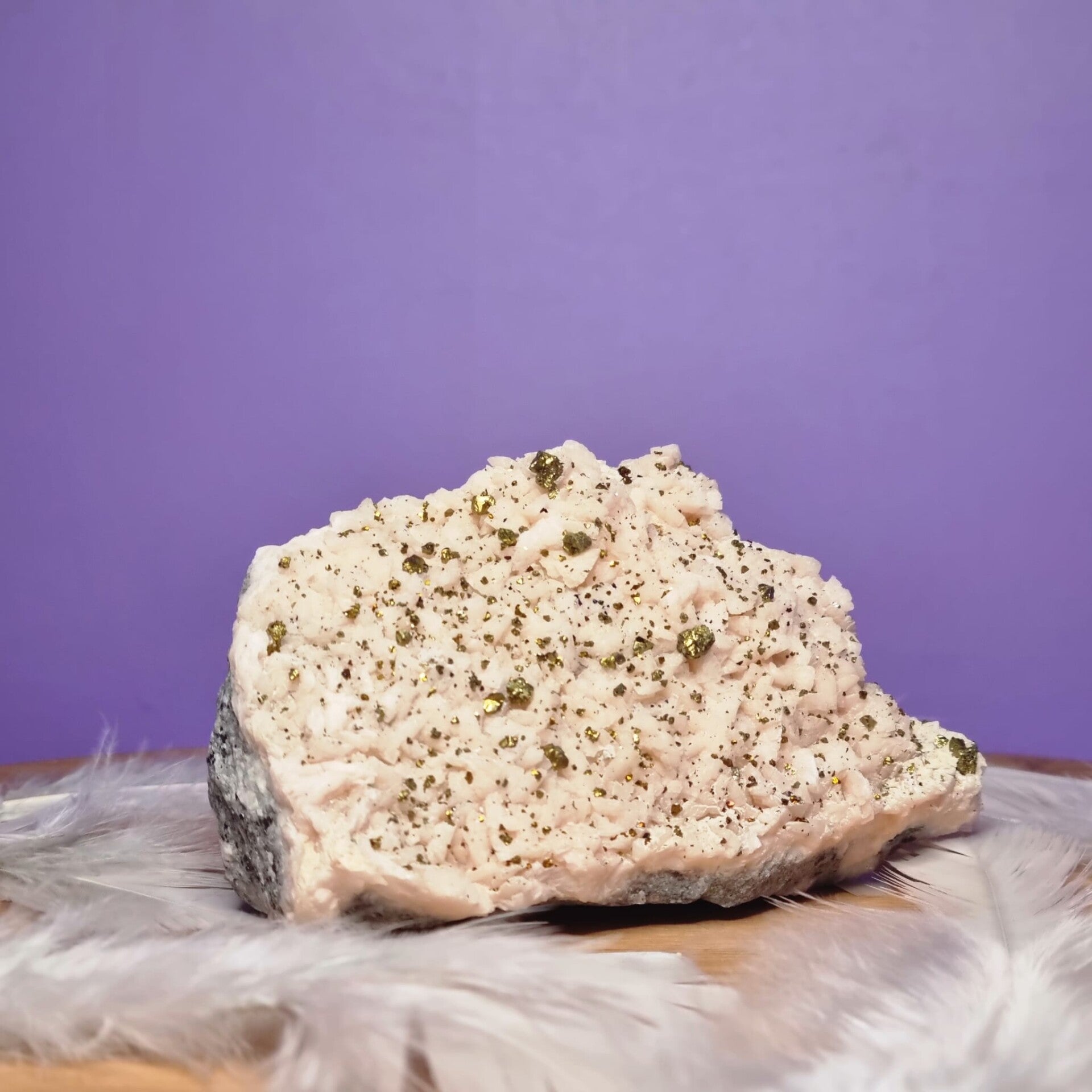 Deze bijzondere combinatie uit Bou Bekker valt op door zijn zachte roze dolomietbasis met daarop kleine, helder goudkleurige chalcopyrietkristallen. Het contrast tussen de pastelroze ondergrond en de metaalglans van het chalcopyriet maakt dit stuk zowel elegant als opvallend.