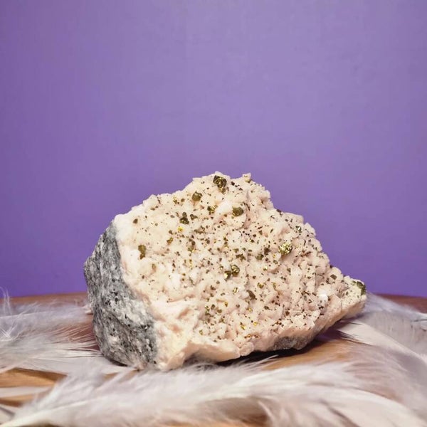 ✨ Chalcopyriet op Roze Dolomiet – Bou Bekker, Marokko