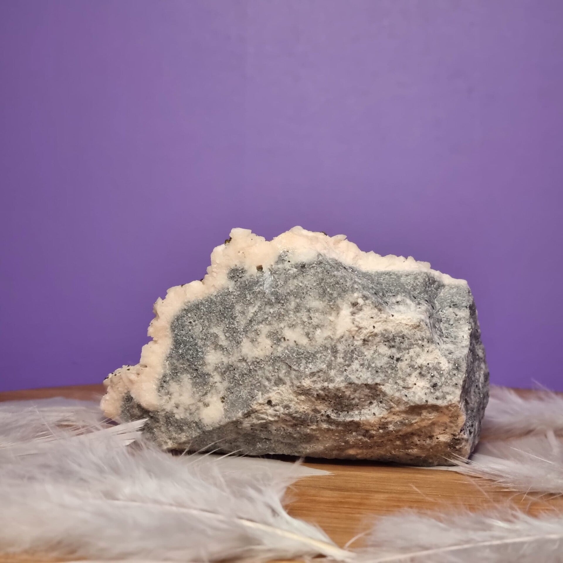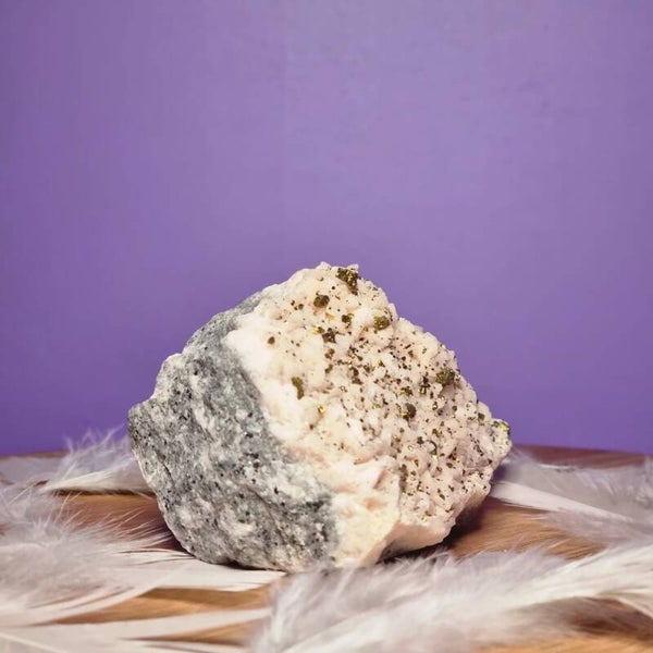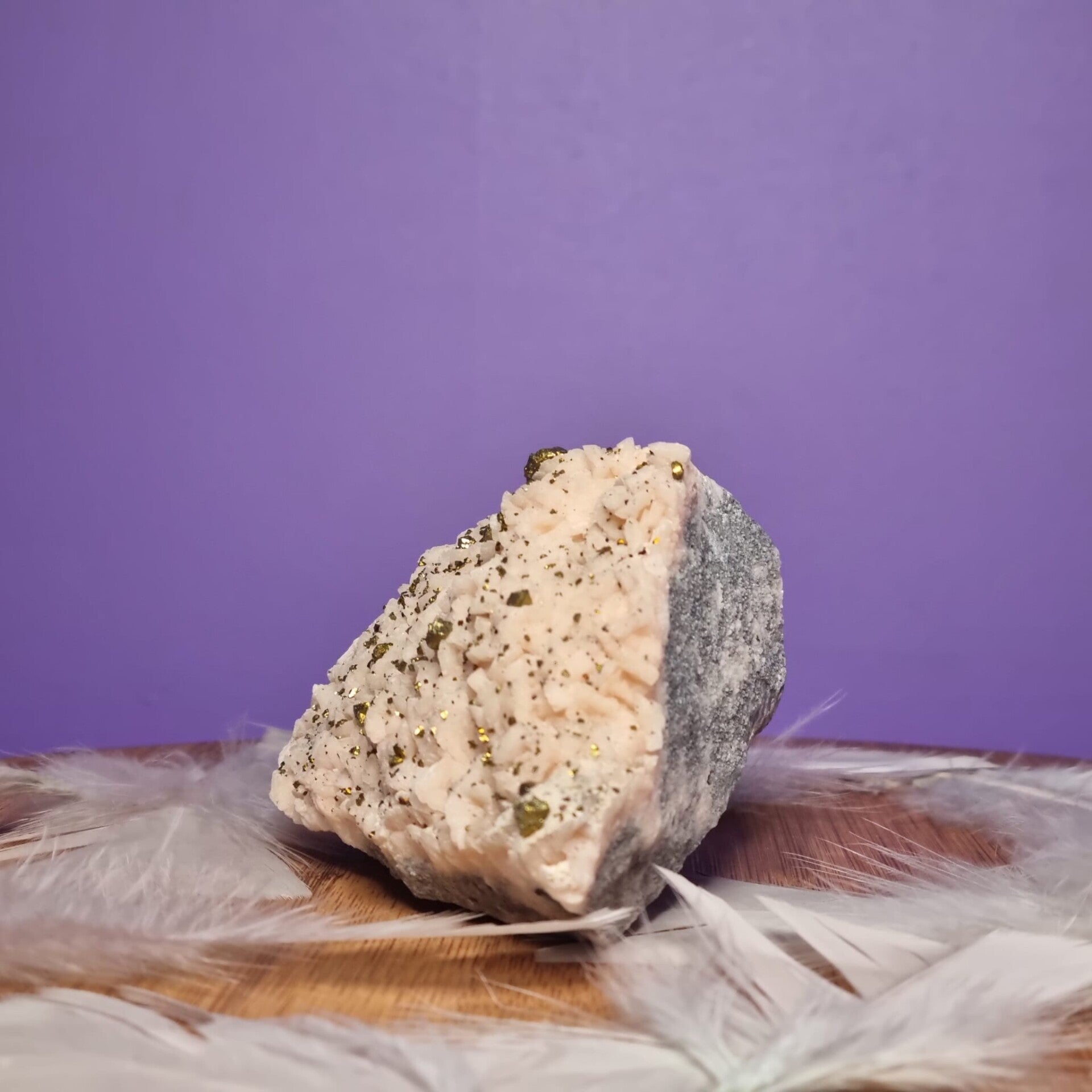 Chalcopyriet staat bekend om zijn warme, stimulerende energie en wordt vaak geassocieerd met creativiteit, doorzettingsvermogen en optimisme. De dolomiet voegt hier rust en stabiliteit aan toe, waardoor het geheel zowel levendig als evenwichtig aanvoelt.
